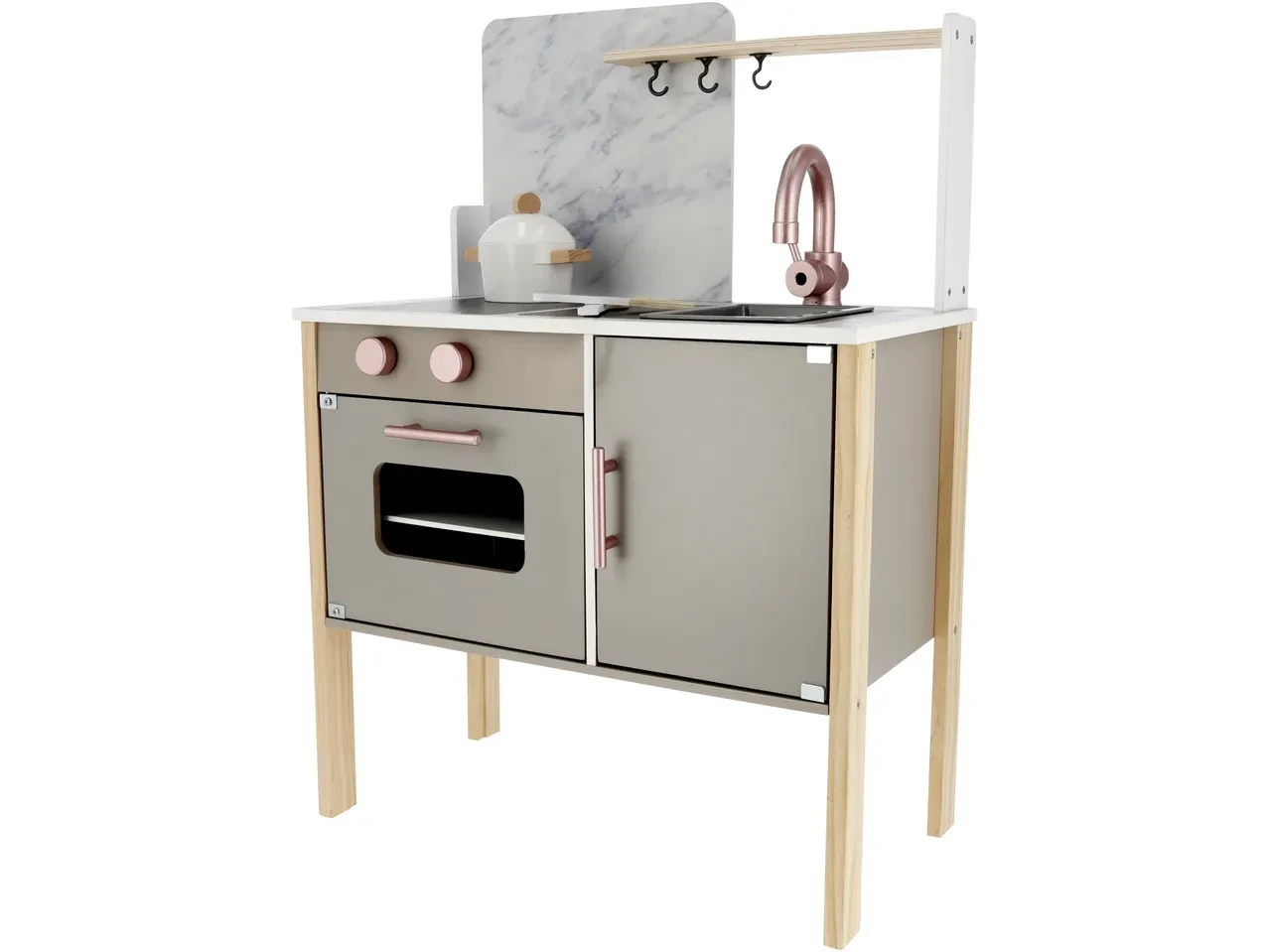 Дитяча дерев’яна кухня Lupilu — це іграшка, яка перетворює гру на справжню пригоду. Її стильний дизайн у сіро-рожевих тонах виглядає як міні-копія сучасної кухні, а кожна деталь продумана до дрібниць.